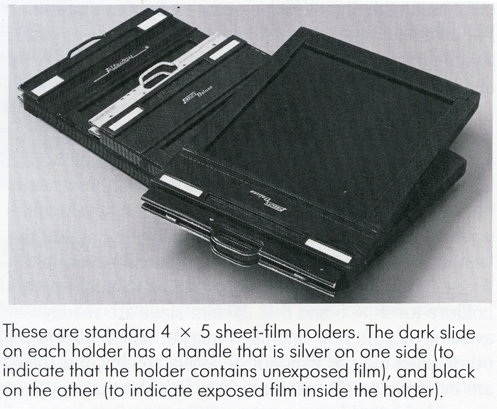 So let's go for it. Time for the thrill of your life. Fill in a couple of film holders with some sheets. Don't forget, total darkness on loading. It takes practice. Do it first in the clear with some wasted sheets or cut some paper to the right size to practice.