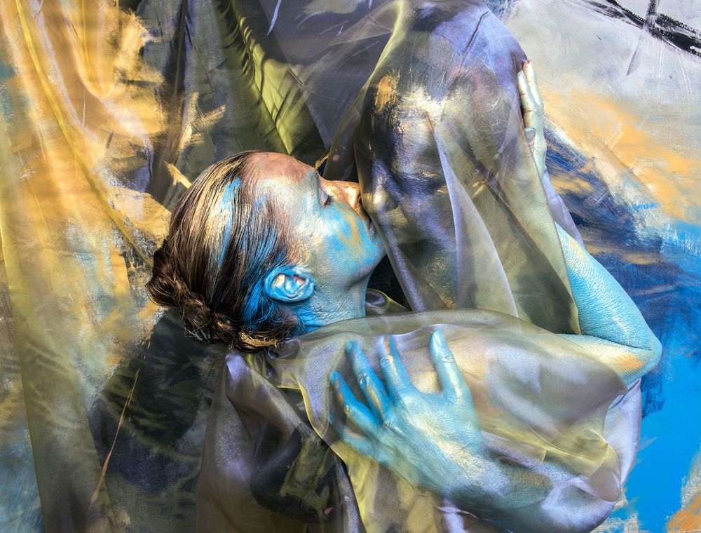 To make her statement Edith combined photography and painting - her two passions. For the photo she paints an abstract background. Then she paints the model in the colours of the background painting. She also uses all kinds of props, which are the finishing touches of the art work.